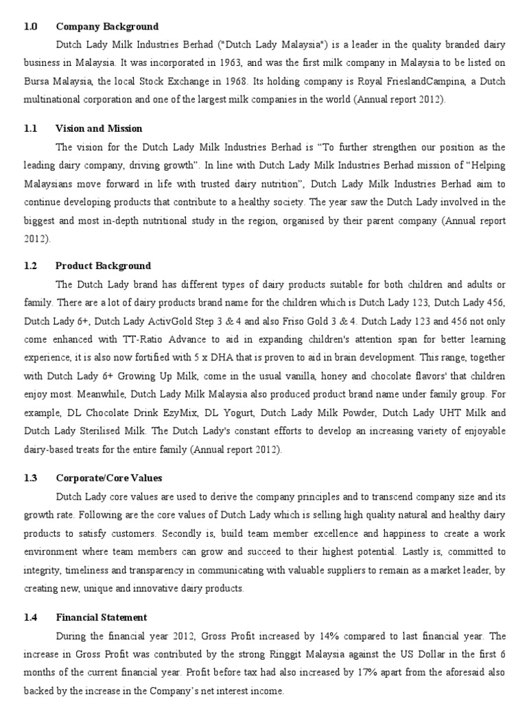 Today DLMI is a 600-strong company that offers an extensive range of quality and delicious milk based dairy products. Its holding business is Royal FrieslandCampina a Dutch. The Directors of Dutch Lady Milk Industries Berhad DLMI or the Company regard Corporate Governance as important to the success of.